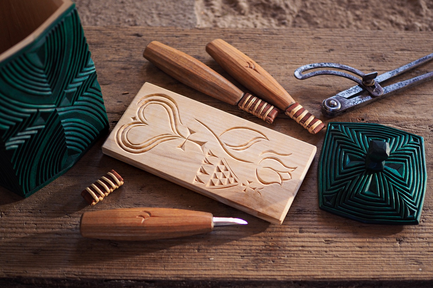 I denna kurs får du lära dig de grundläggande metoderna för att komponera och skära yttäckande, folkliga mönster på frihand. Med endast några få hållpunkter skär du mönstret med kniven steg för steg vilket ger ett livfullt uttryck. Du lär dig också om hur passaren används för att konstruera urgamla geometriska mönster. Med denna enkla metod kan du tälja avancerade mönster utan vare sig bildhuggeriverktyg eller hyvelbänk. Under kursen får du också kunskap om måleri av mönster samt hur du enklast underhåller dina verktyg.